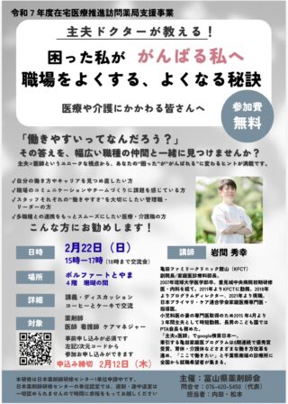 お知らせNews TOP お知らせ 令和7年度在宅医療推進訪問薬局支援事業 すべて 協会からのお知らせ 各委員会 介護保険情報 とやまね通信 日本介護支援専門員協会 2026.01.09協会からのお知らせ 令和7年度在宅医療推進訪問薬局支援事業 主夫ドクターが教える!困った私ががんばる私へ 職場をよくする、よくなる秘訣医療や介護にかかわる皆さんへ日時:2月22日(日)15:00~17:00(18:00まで交流会)場所:ボルファートとやま 4階 珊瑚の間対象:薬剤師 医師、看護師、ケアマネジャー申込み締切:2月12日(木)※詳細および申込手続きについては、チラシをご確認ください。 前の記事 次の記事